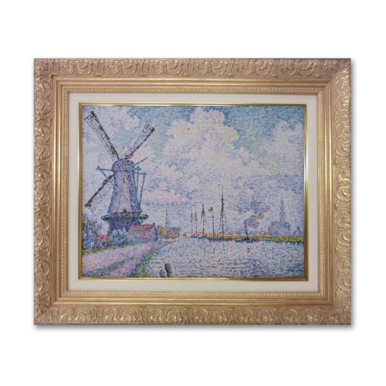 シニャックは、水辺の風景をこのんで描きました。この「オーヴェルシーの運河」が描かれたのは、オランダ。近くで見ると1粒1粒の異なる色の点が、遠くで見ると溶けあって見えます。 風車や船のマストは整然と配置され、静かな風景をつくりだしています。